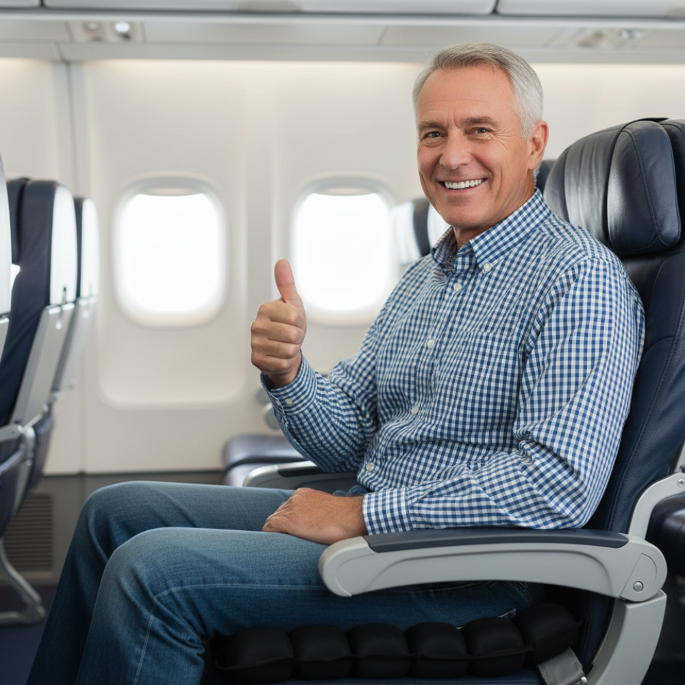 Comfo + Travel Cushion gently hugs your body and absorbs pressure. No more sharp pain. No more constant moving. Just pure, soft support that makes every seat feel first-class.